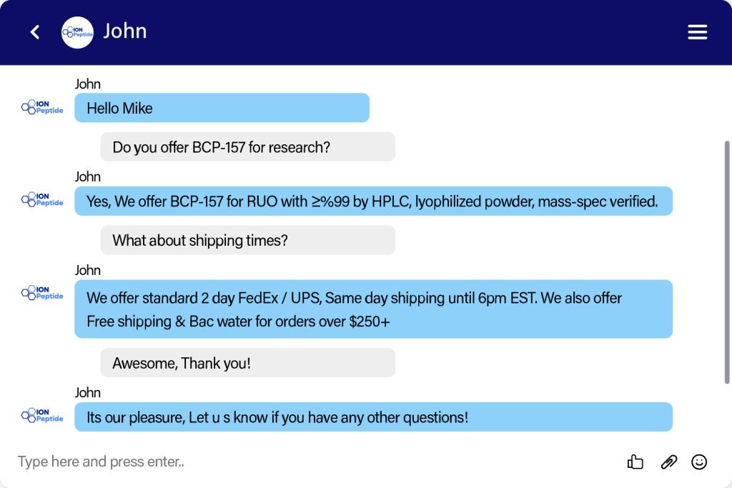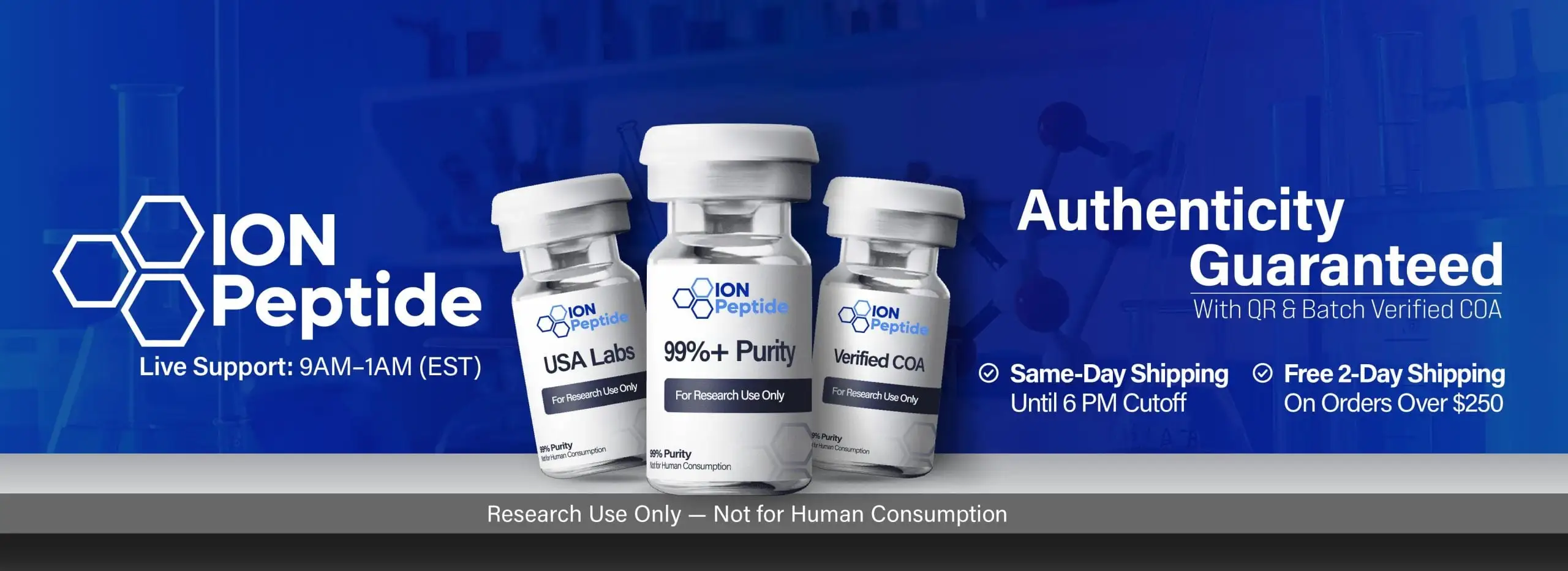 Disclaimer: IonPeptide.com products are for research use only and are not intended for human or animal consumption. They are not approved for medical, diagnostic, or therapeutic use, and no instructions for preparation, administration, or dosage are provided. All products are labeled “For Research Use Only – Not for Human or Animal Use” in accordance with 21 CFR 809.10(c). Statements on this website have not been evaluated by the FDA. Buyers are solely responsible for the lawful handling and use of these products.